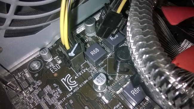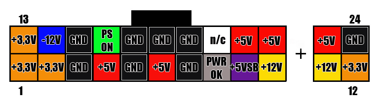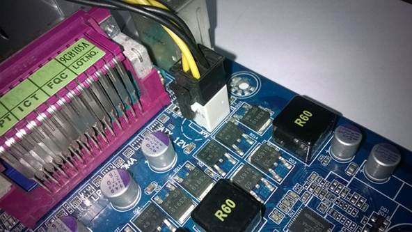 Затем обязательный четырех контактный разъем с черными и желтыми проводами 12В (ATX12V) для электропитания процессора. Ближе к ключу разъема желтые, дальше – черные провода, и никак не наоборот.
