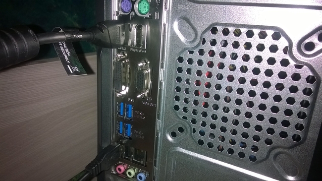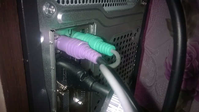 Подключаем внешние устройства. Фиолетовый и зеленый разъемы предназначены для подключения клавиатуры и мыши соответственно.