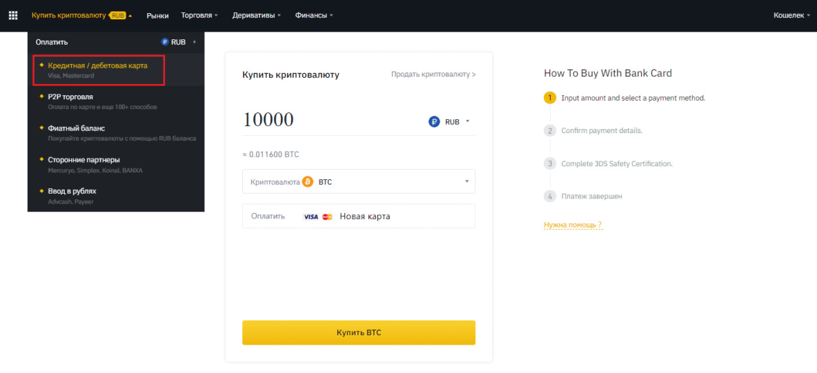 Для пополнения счета на Binance доступны карты Visa и MasterCard.