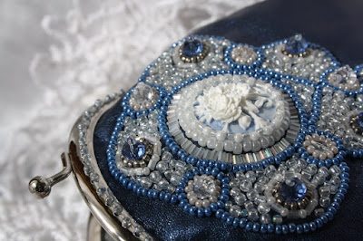 Из последнего — мини-сумочка из синей кожи с лёгким блеском «металлик» с вышивкой бусинами и бисером: