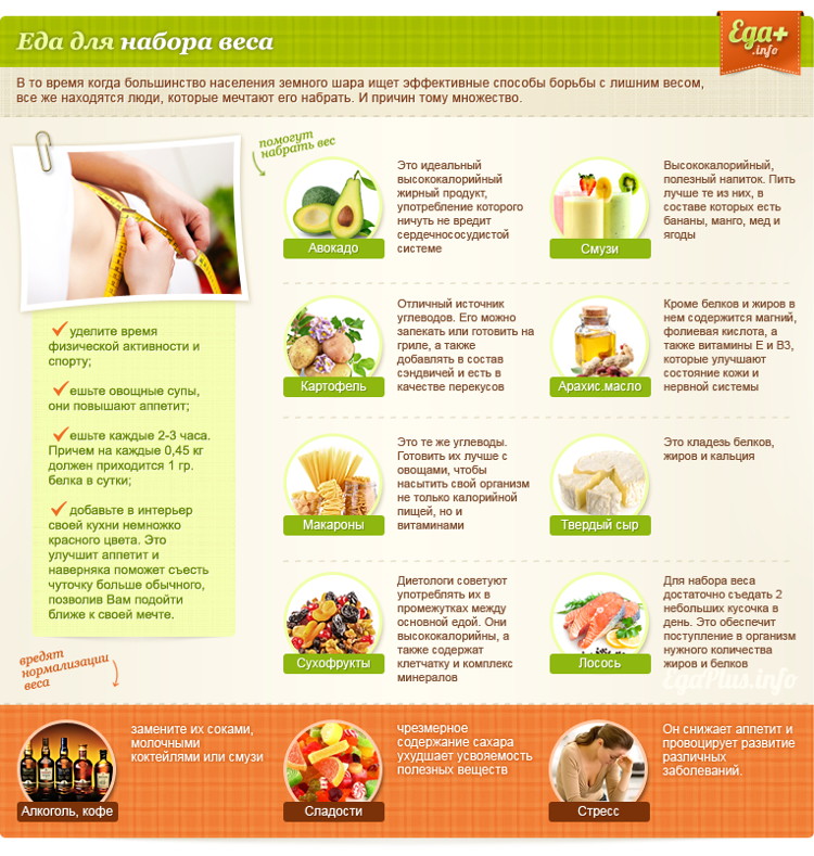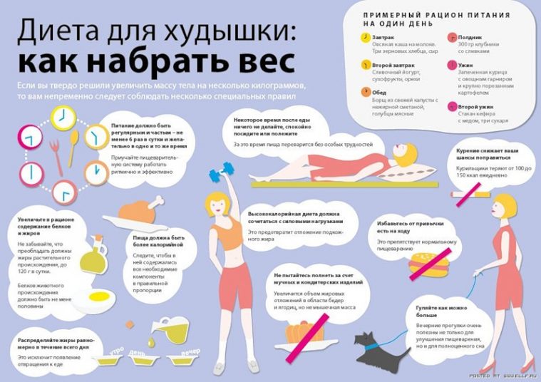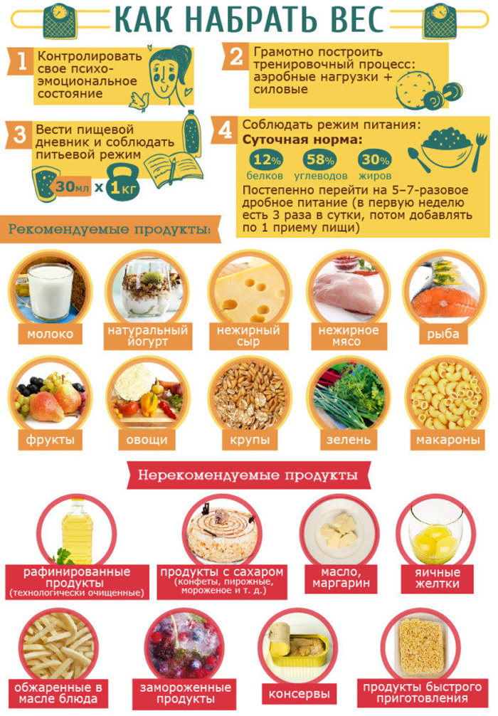 При диетическом питании для набора веса главное не сколько еды вы съедаете в день, а какую именно. Нерегулярное и непродуманное питание, которое состоит только из мучного и жирного, конечно, повлияет на увеличение веса, но в таком случае жир будет откладываться неравномерно, складками. Для того чтобы прибавить в весе, необходимо продуманное питание с заранее отобранными продуктами.