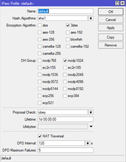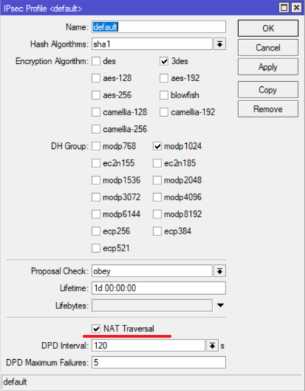 Добавляем в таблицу firewall filter разрешающее правило доступа к маршрутизатору извне для портов UDP 1701, 500 и 4500. Если у вас белые IP непосредственно на маршрутизаторе без пробросов через Edge, галочку NAT Traversal НУЖНО СНЯТЬ!Проверяем дефолтный IPsec-профиль: