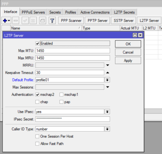 на ней поднял L2TP-сервер с включенным шифрованием IPsec;