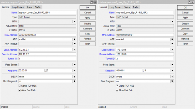 Создаем EoIP-туннели по аналогии с R1, только меняем местами local и remote IP L2TP/IPsec-линков маршрутизатора R2. Bonding-интерфейс такой же, как на R1:
