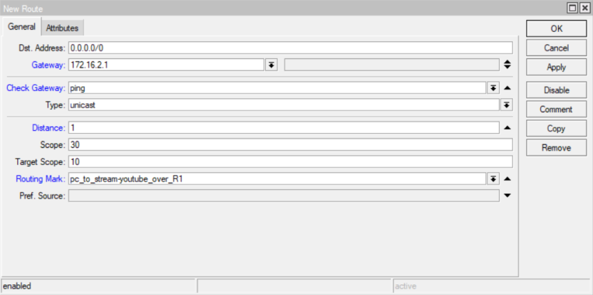 Туннели загорелись волшебной буквой R, а EoIP – еще и RS. OpenVPN тоже завелся. Теперь можно направлять трафик с компьютера трансляций в наш слоеный бутерброд – в OpenVPN-туннель. Для этого создаем правило /ip firewall mangle и прописываем сразу новую таблицу маршрутизации: