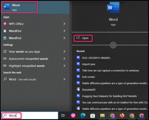 Шаг 1: Нажмите кнопку «Пуск», чтобы открыть меню «Пуск», и введите в строке поиска файл, который вы хотите создать. Например, если вы хотите создать файл Word, просто введите Word в строку поиска и нажмите кнопку «Открыть».
