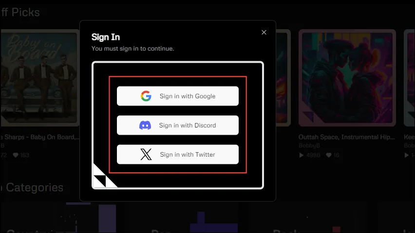 - Нажав на кнопку, вы увидите несколько вариантов входа. Вы можете войти в систему, используя свою учетную запись Google, Discord или X (ранее Twitter). Нажмите на предпочитаемый вариант, чтобы выбрать его.
