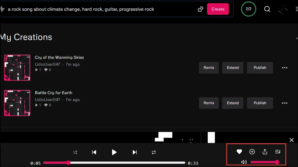 - Udio даже позволяет вам напрямую делиться созданными песнями в социальных сетях или сохранять их в список воспроизведения с помощью кнопок в правом нижнем углу.
