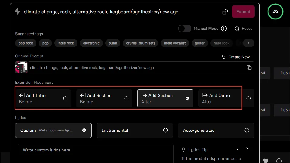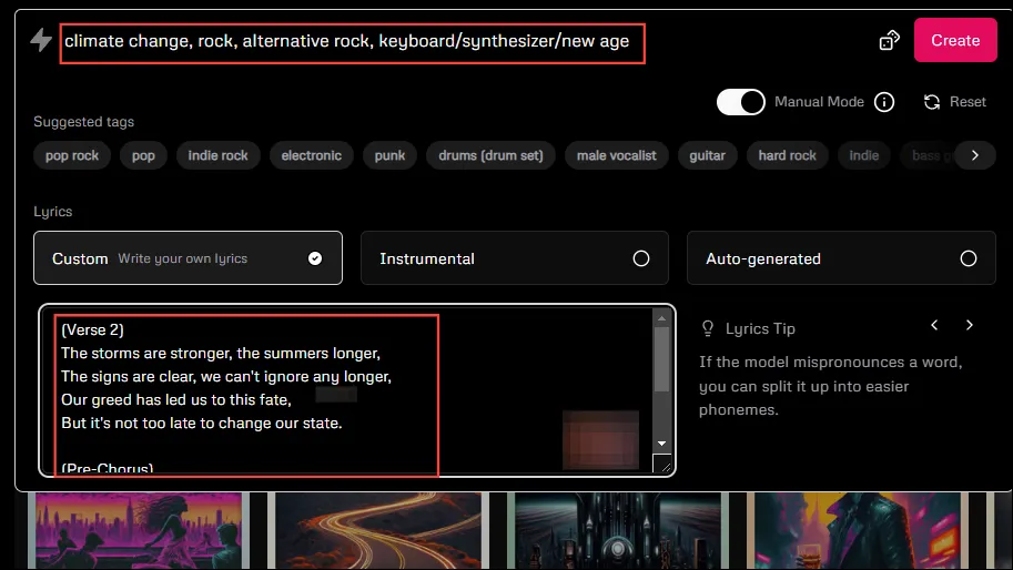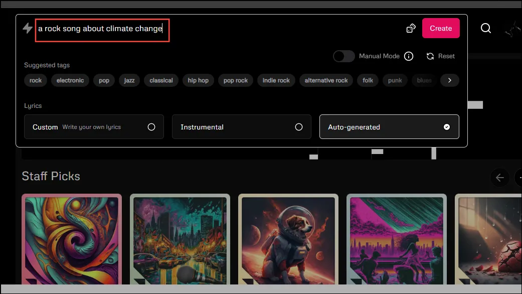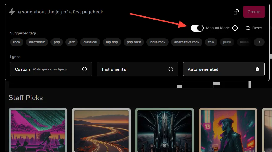По умолчанию запросы, которые вы вводите в Udio, подвергаются значительной постобработке, чтобы улучшить их и сделать их более понятными для модели ИИ. Однако, если вам нужен больший контроль над процессом создания музыки, вы можете попробовать «Ручной режим».