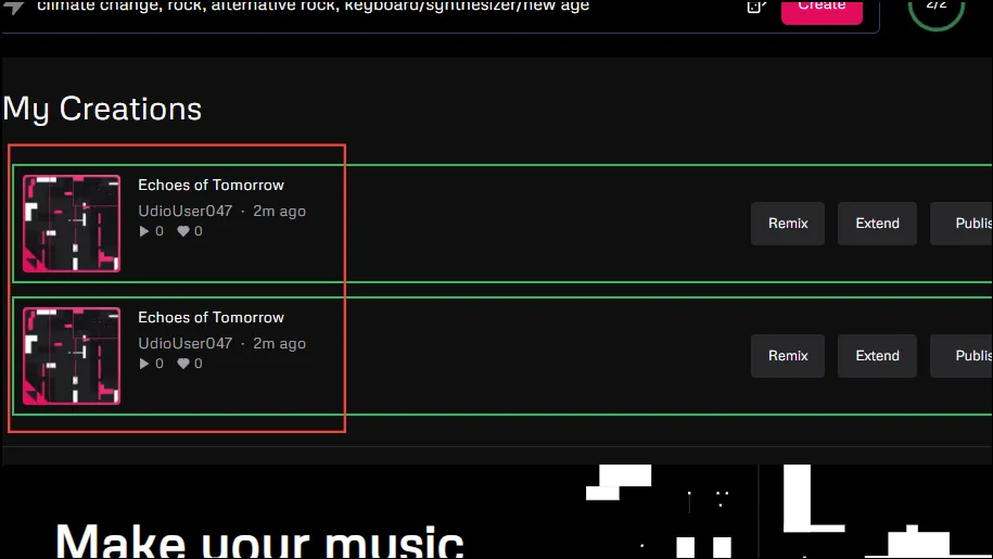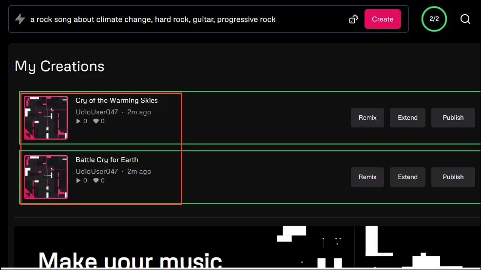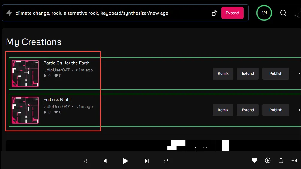 - Udio понадобится несколько минут, чтобы расширить вашу песню и добавить к ней новый текст. Затем он покажет вам расширенные треки. Хотя он использует исходное приглашение, чтобы обеспечить соответствие добавленного раздела стилю трека, вы всегда можете изменить его, предоставив новое приглашение.