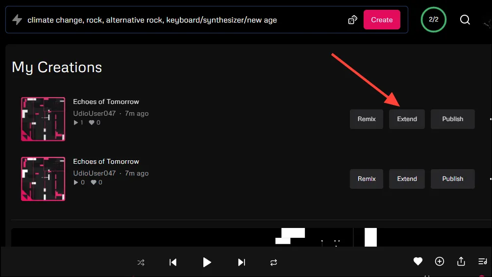 Помимо создания оригинальной музыки, Udio позволяет расширять треки, созданные с помощью этого инструмента. Поскольку он генерирует музыку отрезками по 32 секунды, выбрать тот, который вы хотите расширить, довольно легко.