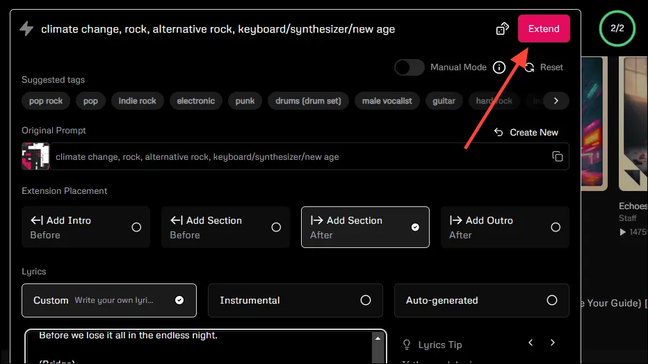 - Просто нажмите на предпочитаемый вами вариант, чтобы расширить песню и добавить еще текст в поле текста. Когда вы закончите, нажмите кнопку «Продлить» вверху. Здесь вы также сможете увидеть исходное приглашение.