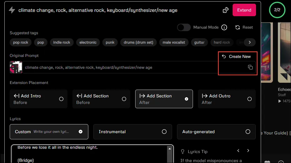- При расширении песни вы можете вернуться к исходному приглашению, щелкнув значок копирования в исходном приглашении. Аналогичным образом вы можете начать новое создание, используя кнопку «Создать новое».