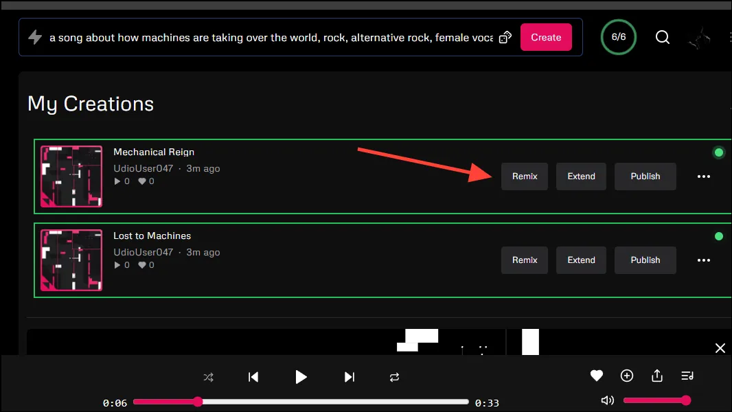 - Чтобы сделать ремикс на песню, нажмите кнопку «Ремикс» рядом с ней в разделе «Мои творения».