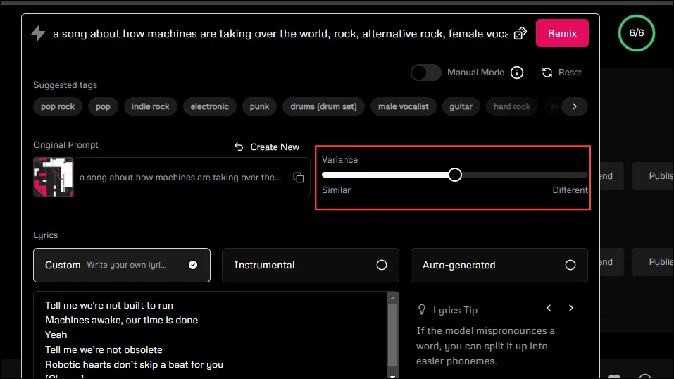 Если вы хотите опробовать другую версию созданной вами песни, вам может помочь функция Udio «Remix». В настоящее время вы можете делать ремиксы только на 30-секундные треки.