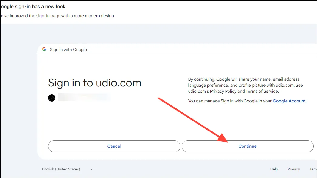 - Вам нужно будет предоставить Udio разрешение на доступ к вашей учетной записи для любого варианта, который вы выберете. Для этого нажмите кнопку «Продолжить».