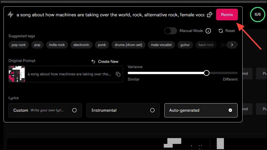 - В этом случае Udio также будет полагаться на исходное приглашение, но вы можете изменить его для ремикса. Если вы удовлетворены результатом, нажмите кнопку «Ремикс».