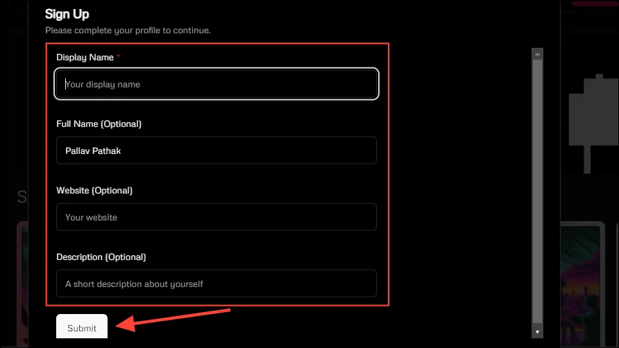 - Вы попадете на страницу регистрации Udio. Здесь вам необходимо ввести такие данные, как имя и описание, прежде чем нажать кнопку «Отправить».