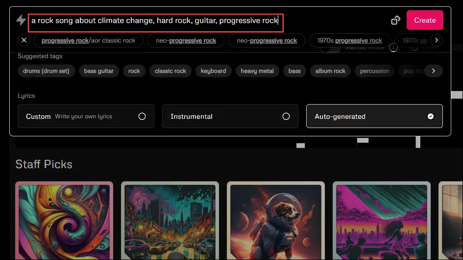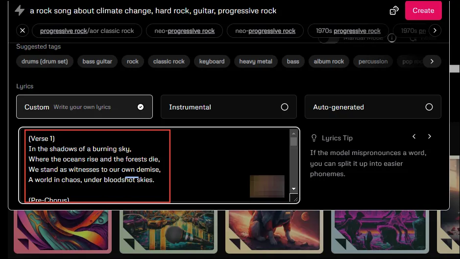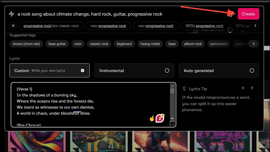 - Добавление нескольких тегов в приглашение позволит Udio легче создавать песни в соответствии с вашими предпочтениями. Для приведенного выше приглашения вы можете добавить такие теги, как «хард-рок», «гитара», «прогрессивный рок» и т. д. Udio также предлагает несколько тегов под текстовым полем, которые вы можете использовать.