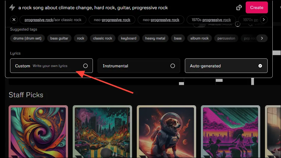 - Далее идет раздел с текстами песен. По умолчанию Udio автоматически генерирует тексты для каждой песни. Однако, если вы хотите, вы можете предоставить свой собственный текст, нажав на опцию «Пользовательский», или выбрать инструментальную версию, нажав на эту опцию.