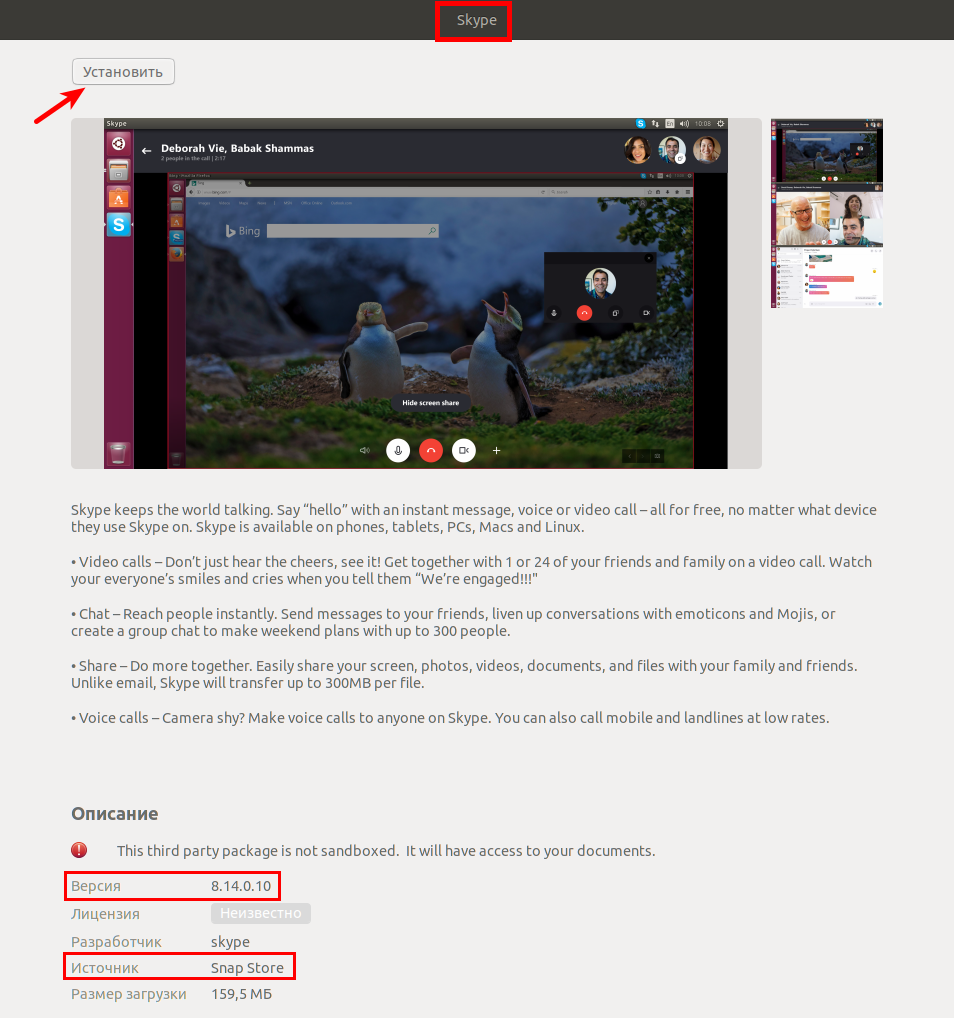 Примечание. Немаловажно заметить, что программа Skype является приложением с закрытым исходным кодом, поддерживаемой Microsoft (Windows), т.е. разработчики дистрибутивов Linux не могут делать улучшения/обновления программы, но Canonical упаковали Skype в пакет snap таким образом, что по мере обновления Skype (стабильная версия) компанией Microsoft, установленный Skype пакетом snap в вашей системе также будет получать обновления. Для этого установка Skype дополнена, флагом —classic.