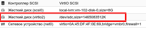 Перейдя в Web-интерфейс Proxmox во вкладке оборудование данной ВМ должно появится новое HDD устройство: