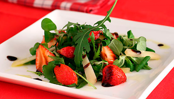 Салат из клубники с бальзамическим уксусом, поданный с рукколой, листьями валерьяны и стружкой пармезана, может быть подан за изысканным ужином. Это отличная идея, для тех, кто хочет попробовать что-нибудь необычное, свежее и вкусное. Для приготовления этого рецепта нужно совсем немного времени.