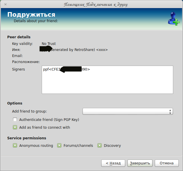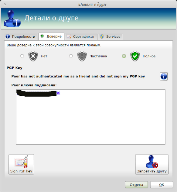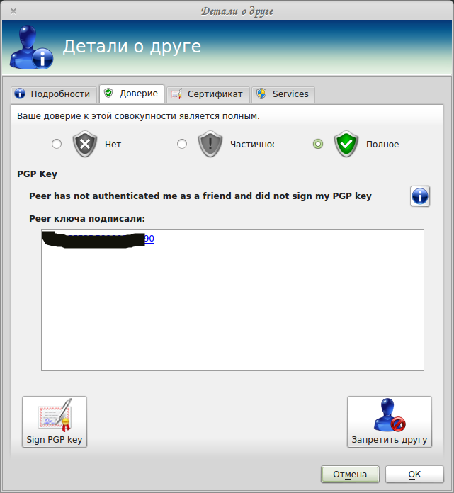 Autentificate friend (Sign PGP Key) — аутентификация друга (необходима подпись PGP ключом).