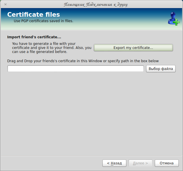 Тут Вы можете экспортировать свой сертификат в файл, нажав кнопку «Export my ceetificate…» и добавить сертификат друга либо просто перетащив в окно файл сертификата, либо, нажав кнопку «Выбор файла», выбрать необходимый файл вручную.