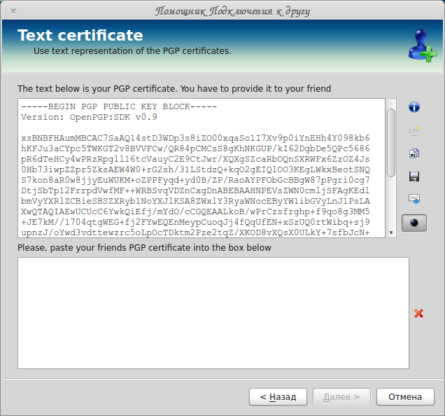 В верхнем поле отображается Ваш сертификат, а в нижнее поле необходимо вбить сертификат друга. Набирать такое количество несвязанных между собой по смыслу символов — гемморой еще тот! Потому советую воспользоваться буфером обмена. После того, как Вы скопировали и вставили сертификат друга — нажимаем кнопку «Далее».