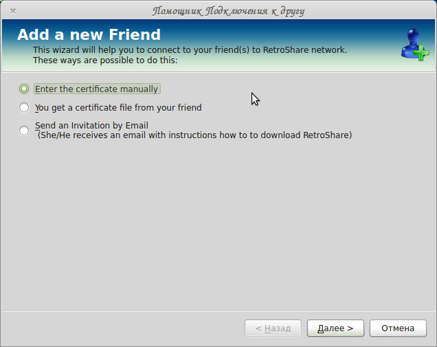 — You get a certificate file from you friend — у Вас есть файл сертификата Вашего друга. При выборе этого вида добавления товарища следующее окно:
