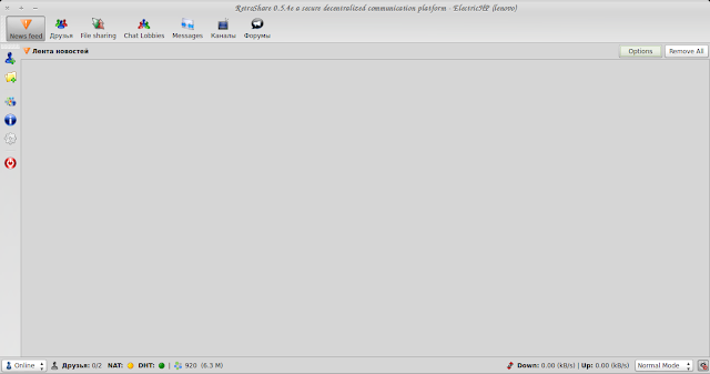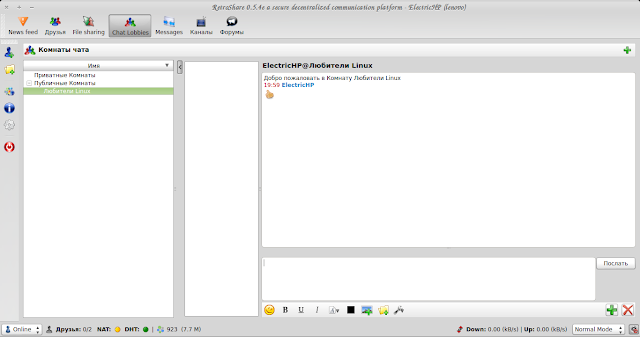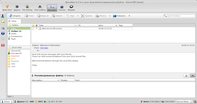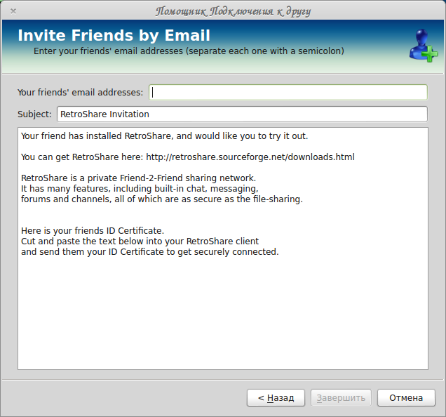 — Send an Invitation by Email — так же Вы можете отправить другу, не имеющему RetroShare, приглашение к использованию программы вместе с инструкцией по установке программы, а так же и Ваш сертификат (ключ PGP):