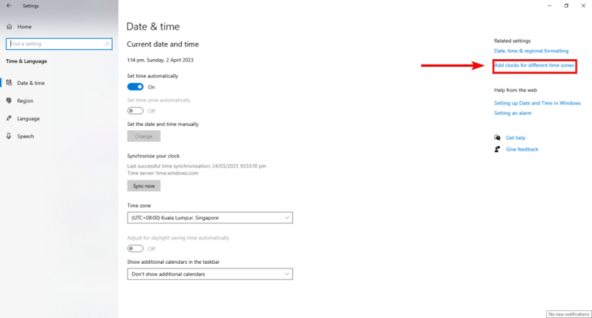 3. На вкладке «Дата и время» нажмите «Добавить часы для разных часовых поясов» на правой панели.