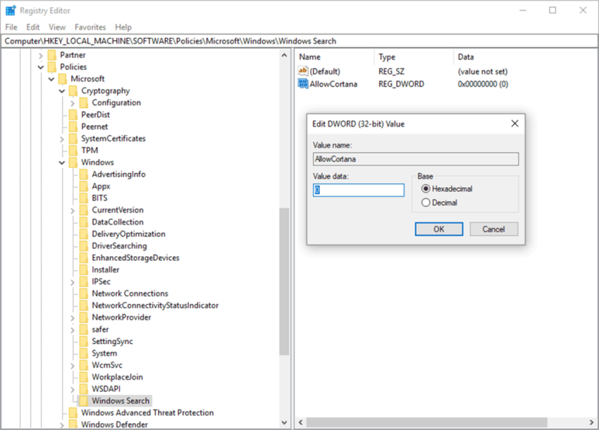 5. Дважды щелкните РазрешитьКортану. Установите для его значения значение 0 и нажмите «ОК», чтобы сохранить.