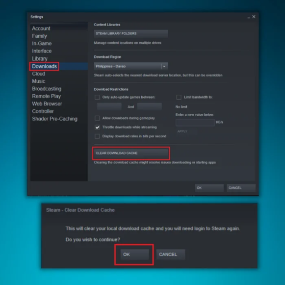 Кэш загрузок вашей библиотеки Steam может временно хранить файлы, относящиеся к играм или программам. Если этот кеш будет поврежден из-за необычных обстоятельств, это может привести к тому, что ваш Steam перестанет отвечать на запросы. Чтобы решить эту проблему, вы можете попытаться очистить кеш загрузок вашего Steam.