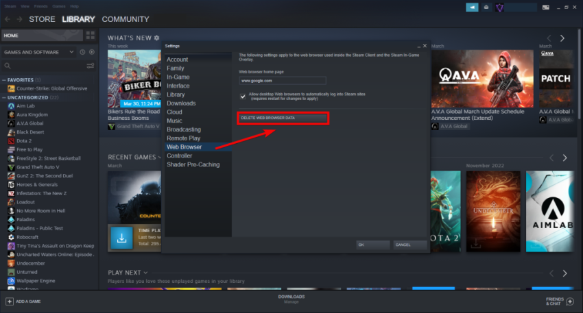 Очистка кеша веб-браузера Steam — одно из потенциальных решений, позволяющих исправить ошибку «Steam не отвечает». Клиент Steam имеет встроенный веб-браузер, который может сохранять временные данные, такие как файлы cookie и файлы кэша, чтобы в будущем веб-страницы загружались быстрее. Однако эти временные файлы могут стать поврежденными или устаревшими, что приведет к проблемам с производительностью Steam.