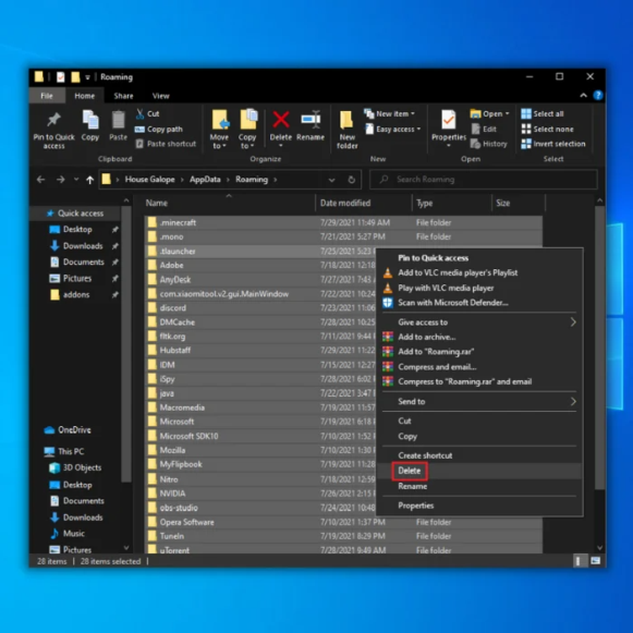 4. Нажмите одновременно Ctrl+A, чтобы выбрать все файлы внутри папки. Затем щелкните правой кнопкой мыши Удалить.