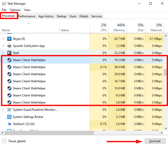 1. Откройте диспетчер задач и завершите все запущенные процессы, связанные со Steam.