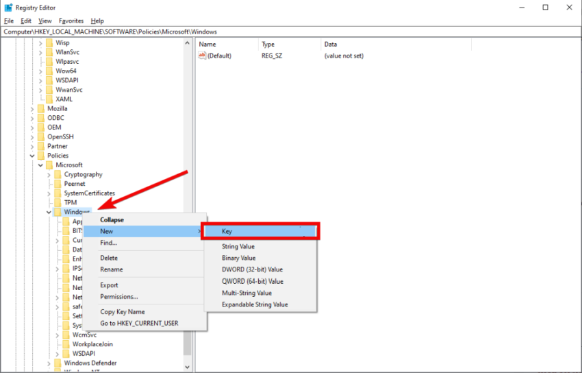 3. Щелкните правой кнопкой мыши папку Windows и выберите «Создать» > «Ключ», чтобы создать новую папку с именем WindowsSearch.