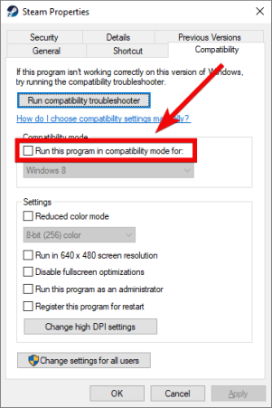 4. Снимите флажок «Запустить эту программу в режиме совместимости с.