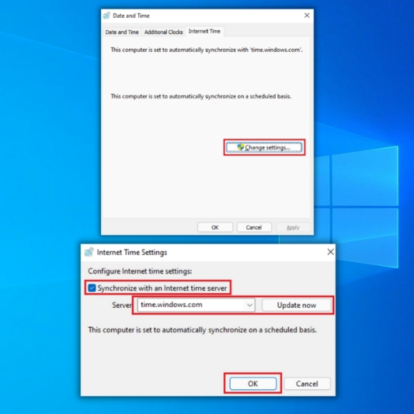 5. В окне «Настройки времени в Интернете» выберите «Синхронизировать с сервером времени в Интернете».