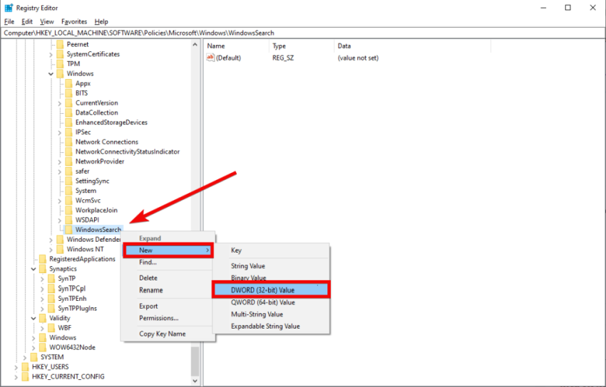 4. Щелкните правой кнопкой мыши WindowsSearch и выберите «Создать» > «Значение DWORD (32-разрядное)» и назовите ключ «AllowCortana».