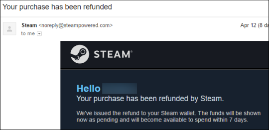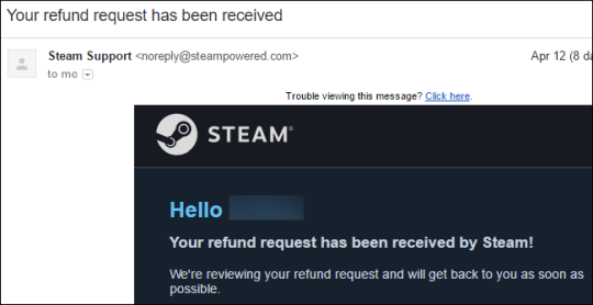 Вы получите электронное письмо от Steam с сообщением, что ваш запрос на возмещение был получен. В электронном письме говорится, что Valve рассматривает ваш запрос и свяжется с вами.