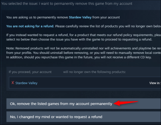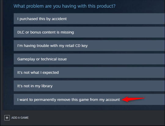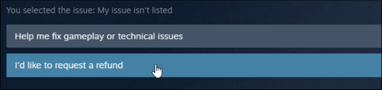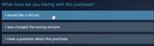 Нажмите кнопку «Я хотел бы вернуть деньги», когда Steam спросит вас, какие у вас проблемы с игрой.