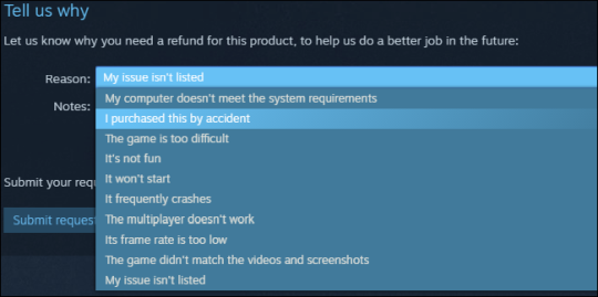 Вас спросят, почему вы возвращаете игру. Выберите причину из поля и введите небольшое сообщение с вашими мыслями. Хотя вам гарантировано возмещение, эти сообщения могут помочь Valve и разработчику игры понять, почему вы не хотите оставлять игру.