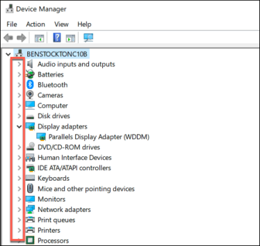 - Меню диспетчера устройств разделяет все подключенное оборудование на категории. Нажмите стрелку рядом с любой из этих категорий, чтобы просмотреть полный список оборудования.