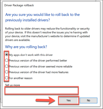 - Windows попросит вас подтвердить, почему вы откатываете свой драйвер. Выберите причину из одного из выбранных вариантов — не стесняйтесь добавлять дополнительный комментарий в поле «Расскажите нам больше». Когда вы будете готовы, нажмите кнопку Да.