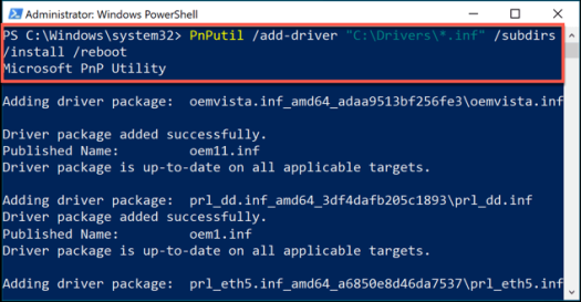 - Если вам потребуется переустановить эти драйверы в будущем, вы можете установить их все сразу, используя инструмент PnPUtil . В окне PowerShell с правами администратора введите