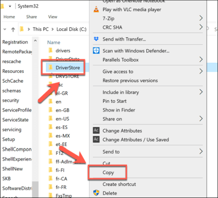 - Щелкните правой кнопкой мыши папку DriverStore и выберите параметр « Копировать» или выберите его и нажмите клавиши Ctrl + C на клавиатуре.